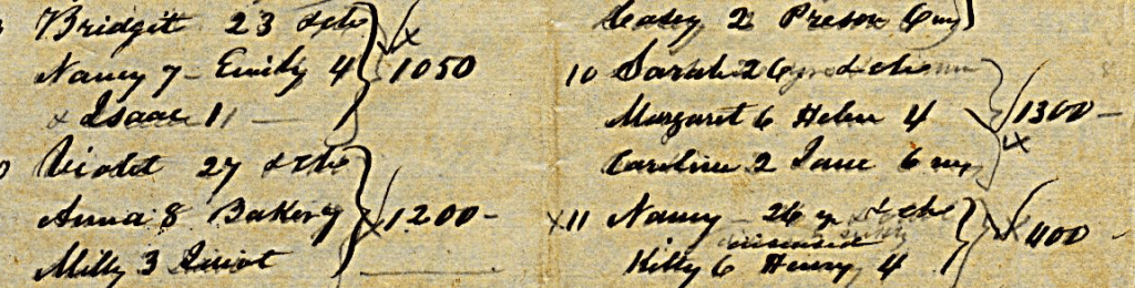 A thirty-one year old Bob was listed in the partition of slaves allotted to Alfred Weeks in the 1846 finalization of David Week’s probate. Included in that partition is Bridget 23, and children Nancy, 7; Emily, 4; and Isaac, 1.