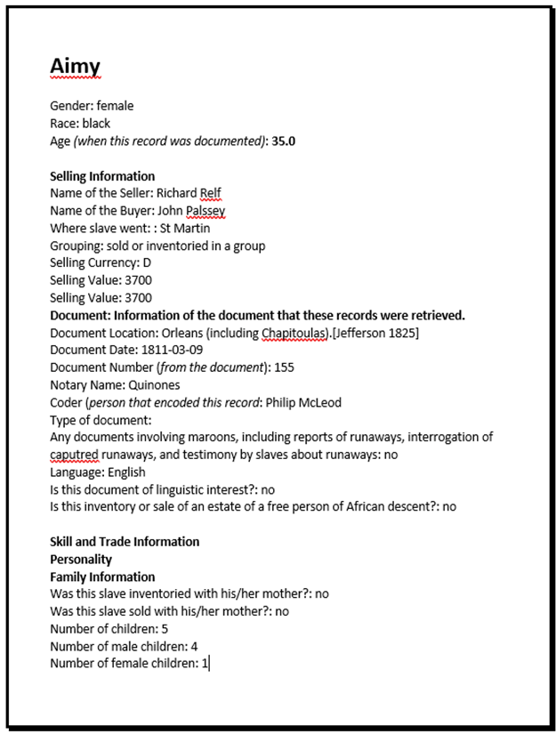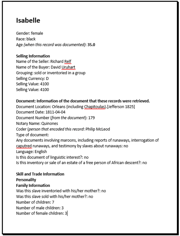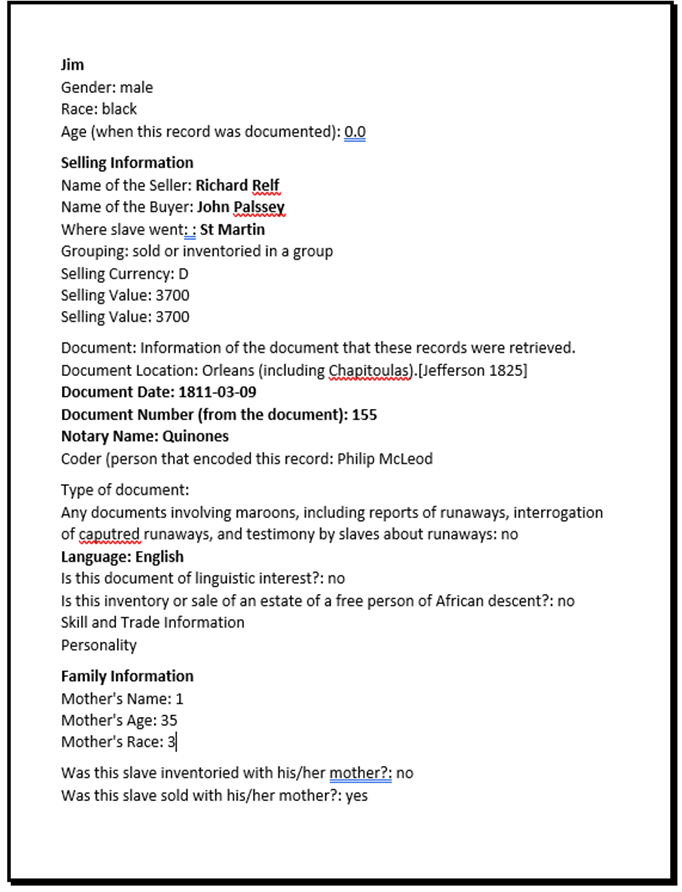 Below is the record of Aimy’s purchase by John Palfrey from Richard Relf and Beverly Chew. Note that her age is listed as 35 in the database (although I transcribed her age as 27 see 1st image above) and that according to the purchase included in John Palfrey’s correspondence, Aimy had 4 sons (Tom, Bob, Ben and Joe) and 1 daughter (Fanny). Although Aimy’s age is detailed below as 35, I don’t think that she is Jim’s mother. I found a separate sale re: a sale by Richard Chew of a woman named Isabelle to David Urquhart in Plaquemine Parish. Isabelle appears to be the most likely person to be Jim’s mother. Isabelle is detailed to have 7 children. When I look through the database, I only found 6 children delivered to Urquhart: Franky, Kate, Lucy, unnamed infant, Patsey and Rody.
